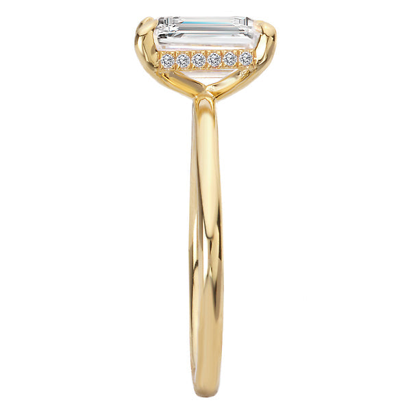 This 14kt yellow gold semi-mount engagement ring has a hidden halo of diamonds underneath a center setting that will accommodate a 9.5x7.5mm emerald cut diamond. (D .08 carat total weight)