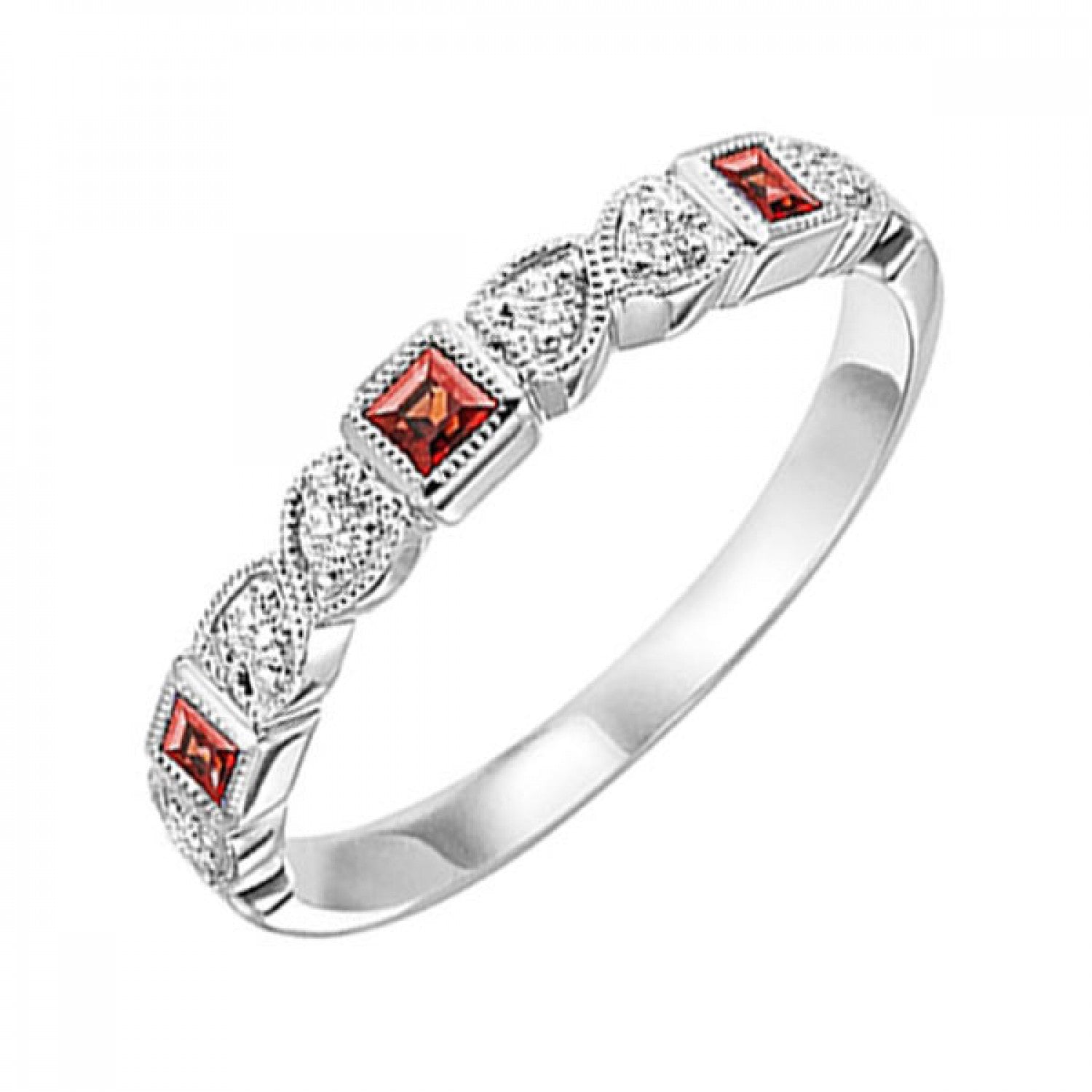Set in 10K white gold, this ring combines a 1/7 carat garnet with 1/12 carat of diamonds for a rich, warm-toned accent.